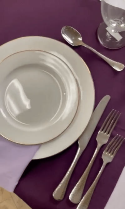 These two place settings have a similar feel and colors, but in one of them we have upgraded the linen fabrics and textures, plates, flatware, and glassware. Both would be a great look for any event!